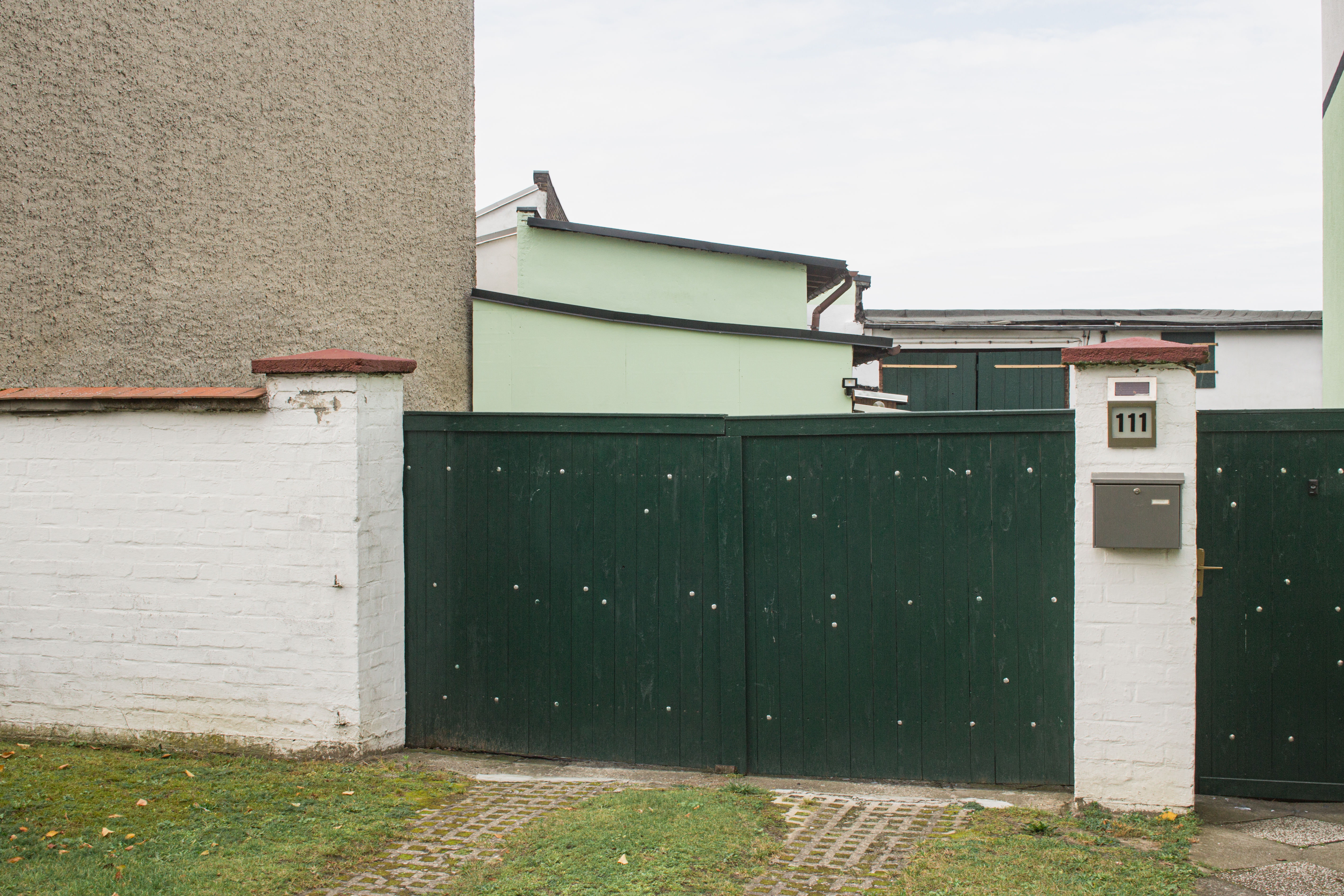 In einem Zeitraum von drei Jahren hat sich Björn Kuhligk, Absolvent der Ostkreuzschule für Fotografie, neugierig zu Fuß und auf dem Fahrrad mit Hilfe einer detaillierten Landkarte durch diese 82 Quadratkilometer bewegt. Ihn interessierte, wie sich innerhalb kurzer Zeit eine Gemeinde so extrem verändern kann und sein Gesicht wechselt, insbesondere Orte, an denen die Vergangenheit des Ortes und seine Gegenwart gleichzeitig sichtbar sind: Dorfstraßen, die plötzlich an einer Lärmschutzmauer enden, ein Hochsitz vor einer überdimensionierten Lagerhalle, Zäune und Häuser, die in ihrer Form darauf verweisen, dass sie bereits in der DDR standen. Vor dem Hintergrund eines städtebaulichen Wachstums, das normalerweise erheblich länger dauert, und der permanenten Unfertigkeit eines Wohnraums stellt er in seiner Arbeit die einfache und dringliche Frage: Wie wollen wir leben? Doch Menschen sind auf den Arbeiten nicht zu sehen. Alles, was er in den Bildern erzählt, verweist auf sie. Kurzum: In seiner Arbeit „Schönefeld“, die exemplarisch für einen Ort steht, der sich mitten im Wandel befindet, setzt er sich auf subtile Weise mit Herkunft und Identität am Beispiel dieser Gemeinde auseinander und schafft ein gegenwärtiges Portrait der Gemeinde Schönefeld, über die es bisher keine fotografische Arbeit gab.